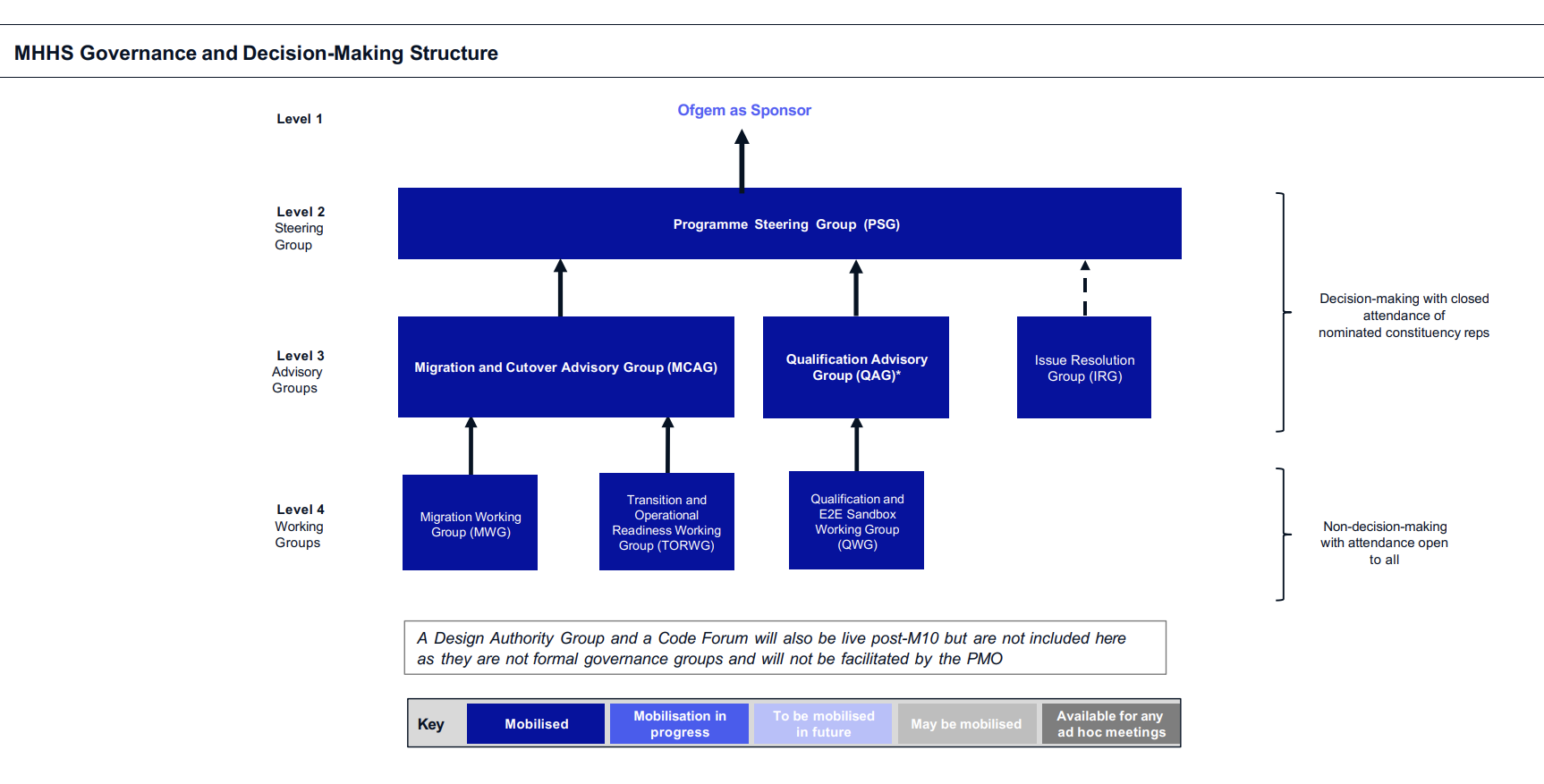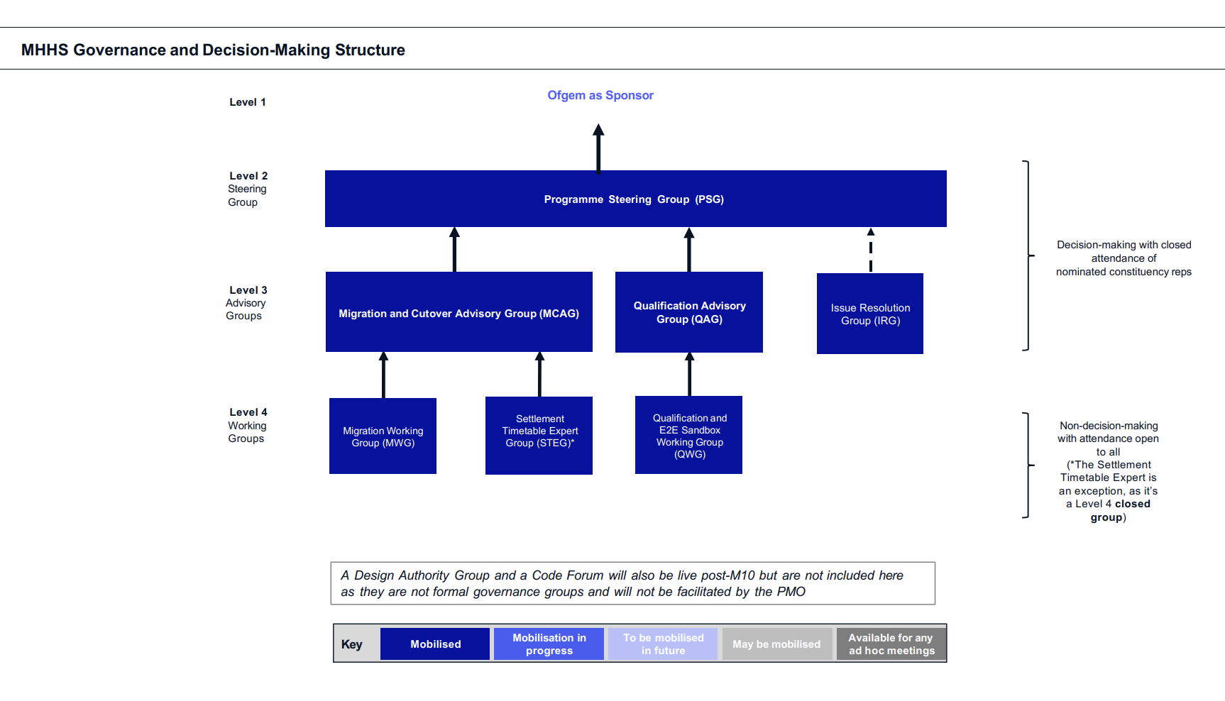 MHHS Programme governance was established at the beginning of the Programme to provide an effective decision-making framework. The framework ensured industry had a voice in decisions and workstreams were effectively driven forward. To support this, we stood up the Programme Steering Group (PSG) and a series of Advisory Groups (Systems Integration Testing Advisory Group, Design Advisory Group, etc.) and Working Groups (Systems Integration Testing Working Group, Qualification Working Group, etc.), and the framework of groups changed and developed over time in line with progress and requirements.