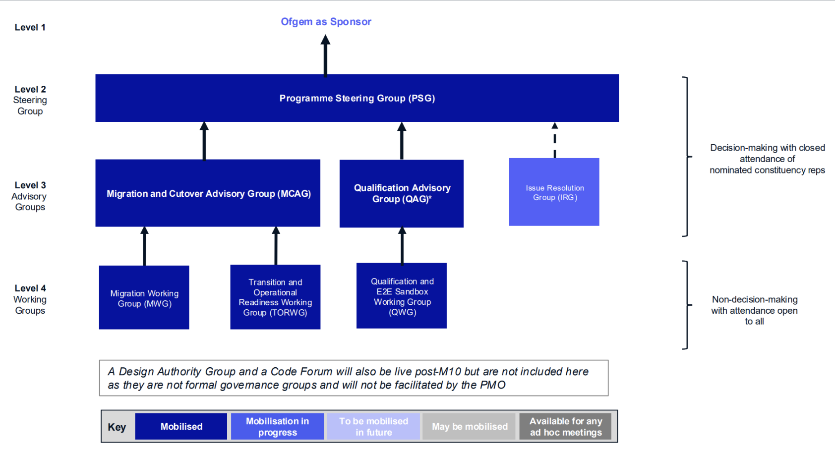 Now we've achieved M10, some areas have completed their work. As a result, the associated groups have been formally closed (Design Advisory Group and Cross-Code Advisory Group). Some Programme activities will continue and therefore the relevant workstreams remain active (Migration & Cutover Advisory Group, Qualification Advisory Group, Systems Integration Testing Advisory Group – now ad hoc).